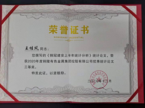 12月29日,在集團公司統計工作會議上,公司獲“2020年度統計工作先進單位”榮譽稱號,公司《銅冠建安上半年統計分析》論文榮獲集團公司優秀統計論文三等獎。